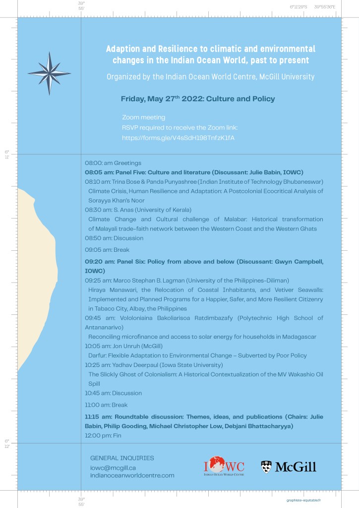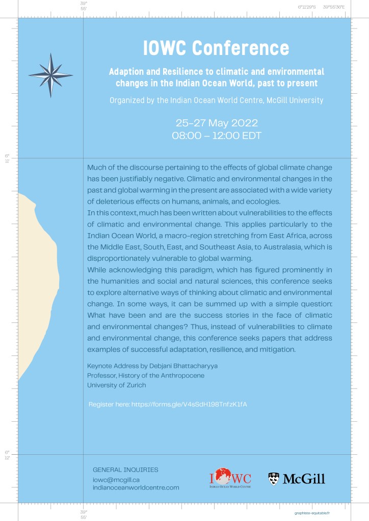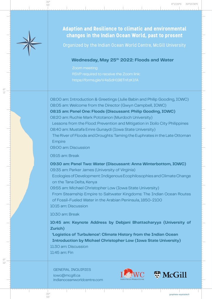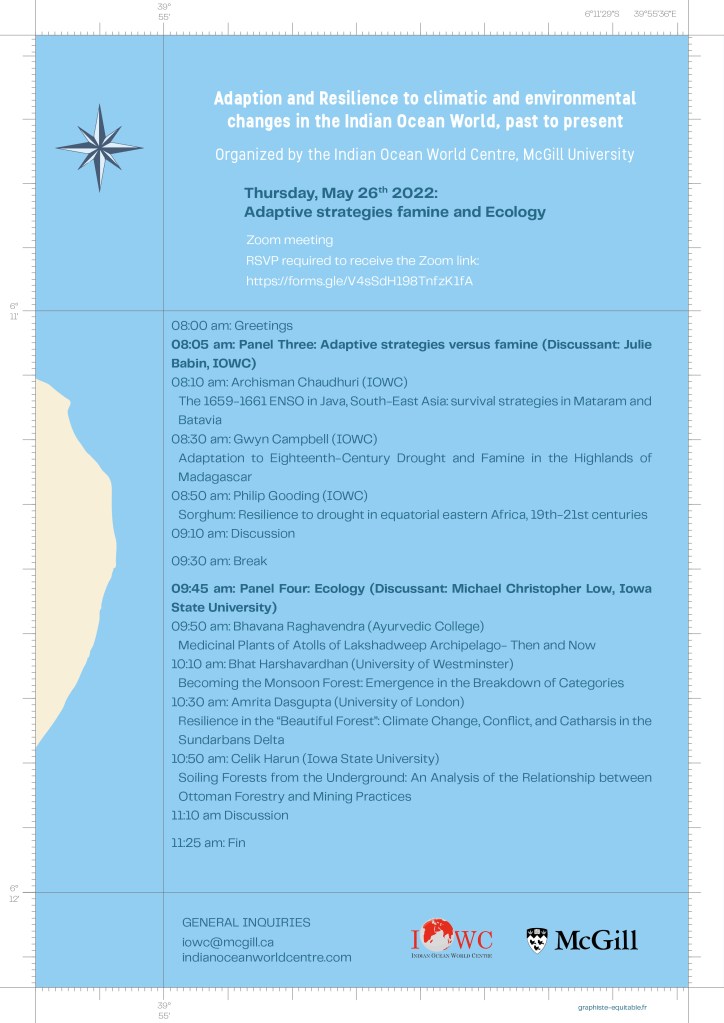 Much of the discourse pertaining to the effects of global climate change has been justifiably negative. Climatic and environmental changes in the past and global warming in the present are associated with a wide variety of deleterious effects for humans, animals, and ecologies. In this context, much has been written on vulnerabilities to the effects of climatic and environmental change. This applies particularly to the Indian Ocean World (IOW), a macro-region disproportionately vulnerable to global warming that stretches from East Africa, across the Middle East, South Asia, and Southeast Asia to East Asia, and south to Australasia. While acknowledging this paradigm, which features prominently in the humanities and social and natural sciences, this conference seeks to explore alternative ways of thinking about climatic and environmental change. In some ways, it can be summed up with a simple question: What are the past and current success stories in the face of climatic and environmental changes? Thus, instead of vulnerabilities to climate and environmental change, this conference seeks papers that address examples of successful adaptation, resilience, and mitigation.