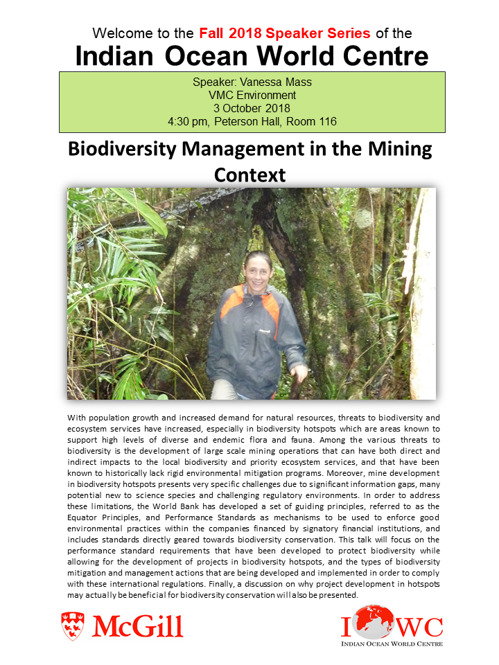 - 3 October: Vanessa Mass (VMC Environment), Biodiversity Management in the Mining Context