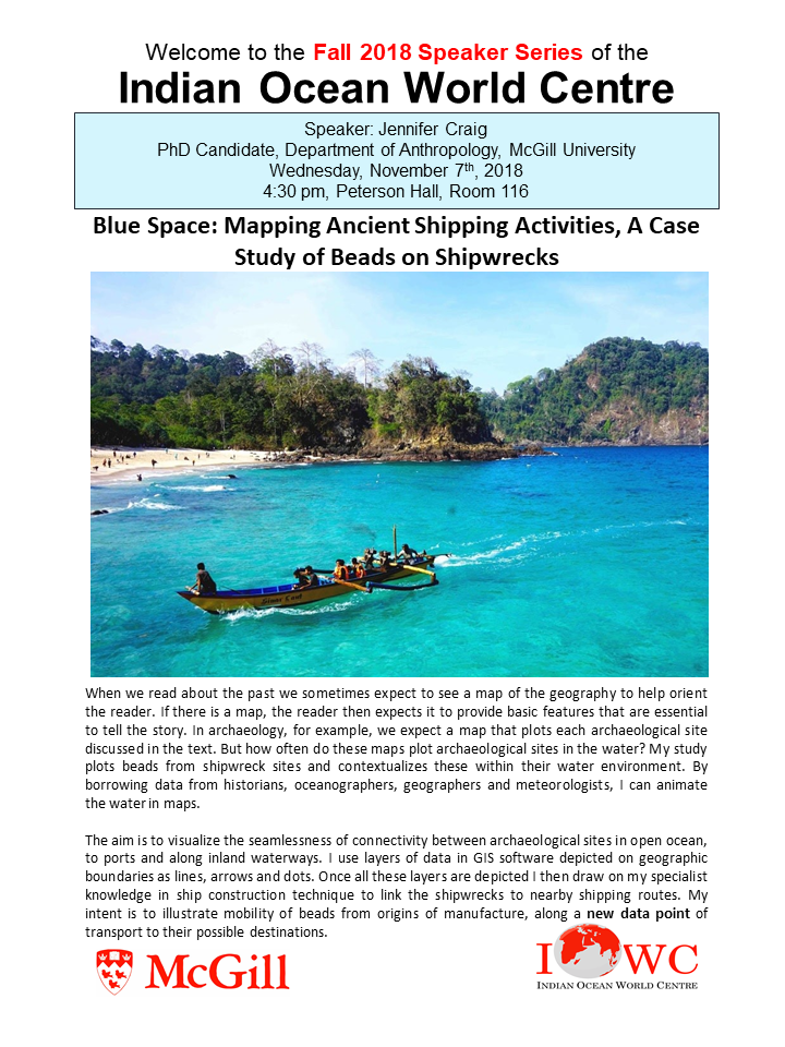 - 7 November: Jennifer Craig (IOWC, McGill University), Blue Space: Mapping Ancient Shipping Activities, A Case Study of Beads on Shipwrecks