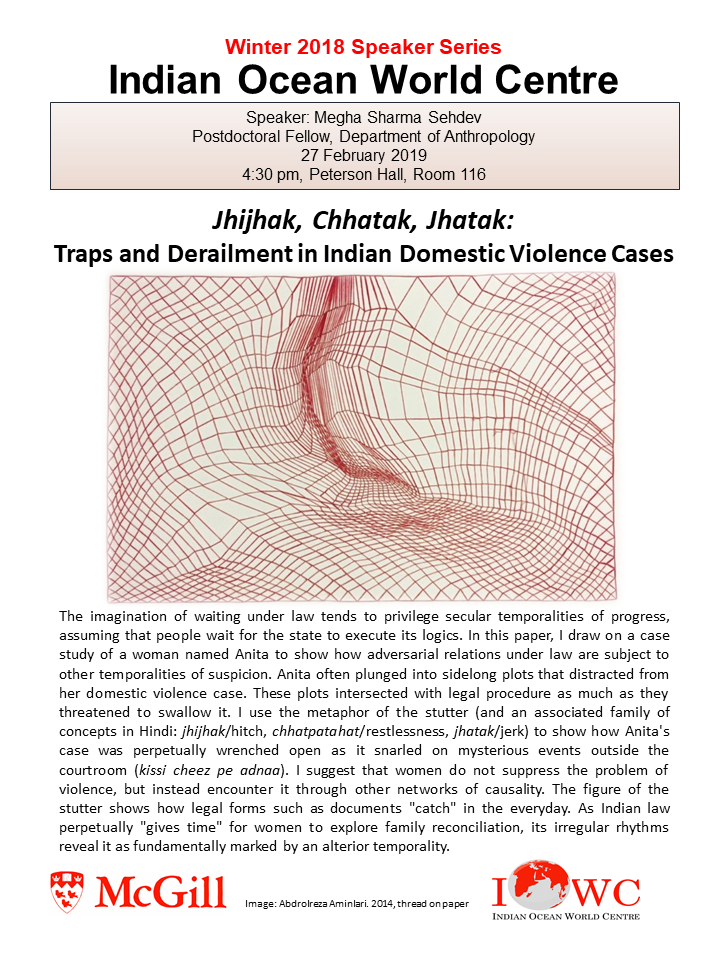 - 26 February: Megha Sharma Sehdev, McGill University, Jhijhak, Chhatak, Jhatak: Traps & Derailment in Indian Domestic Violence Cases