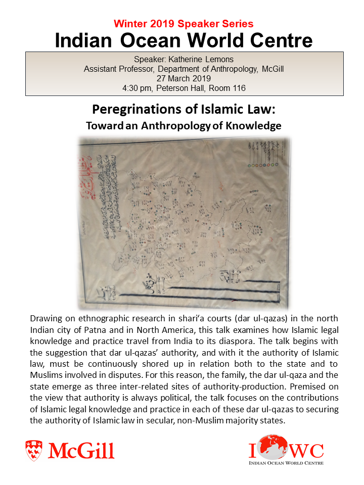 - 27 March: Katherine Lemons, McGill University, Peregrinations of Islamic Law: Toward an Anthropology of Knowledge