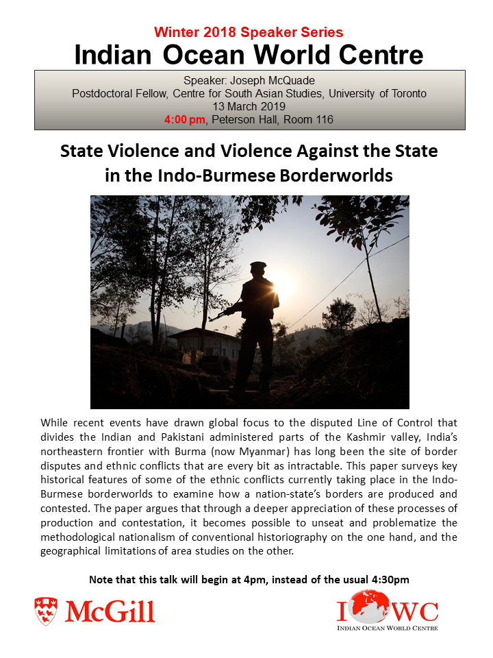 - 13 March: Joseph McQuade, University of Toronto, State Violence and Violence against the State in the Indo-Burmese Borderlands