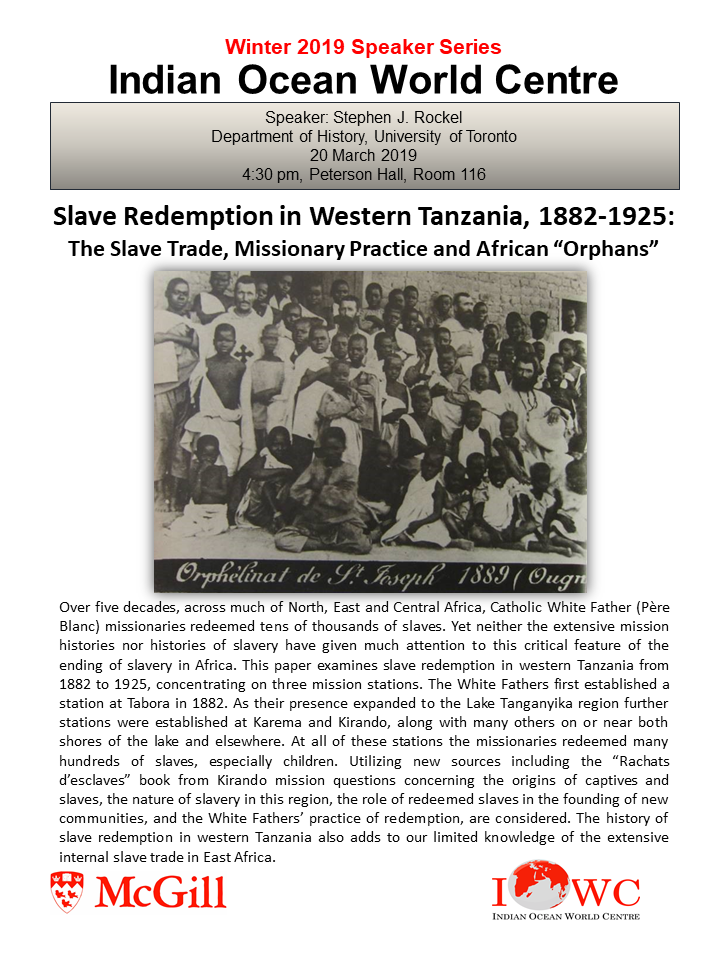 - 20 March: Stephen J. Rockel, University of Toronto, Slave Redemption in Western Tanzania, 1882-1925: The Slave Trade, Missionary Practice and African “Orphans”