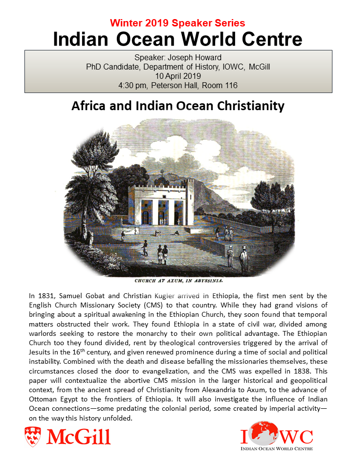 - 10 April: Joseph Howard, McGill University, Africa and Indian Ocean Christianity